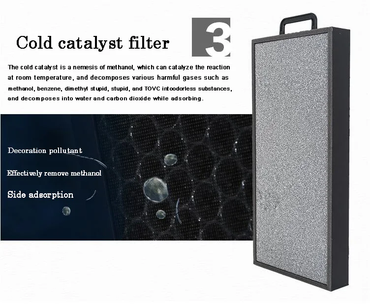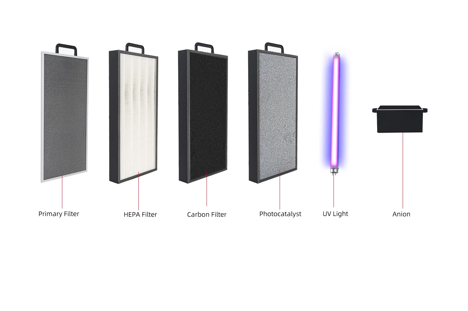- Bộ lọc nhôm có thể rửa được *2 - Bộ lọc HEPA thật cấp 13 *2 - Than hoạt tính *2 - Chất xúc tác quang hóa *2 - Đèn UVC - Chất xúc tác lạnh *2 - Máy tạo ion âm |