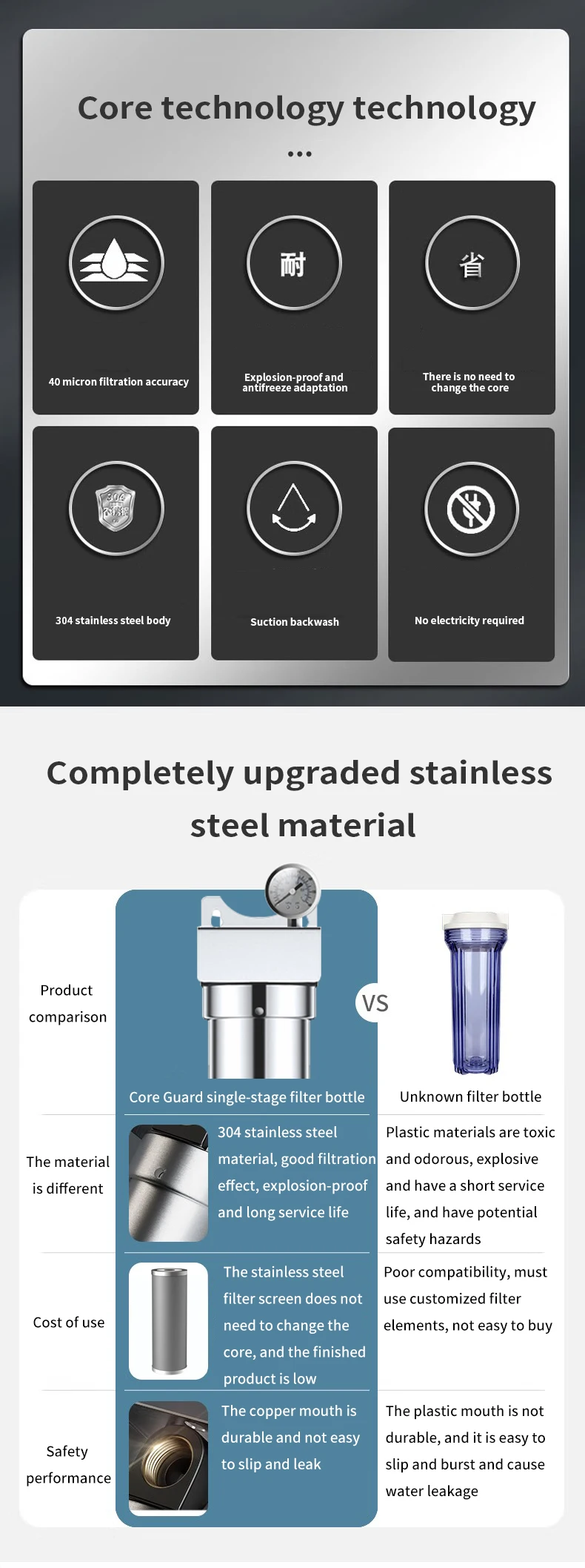 Tóm lại, vỏ lọc nước bằng thép không gỉ công nghiệp UR-HEALTH kết hợp độ bền, tính linh hoạt và thiết kế lấy người dùng làm trung tâm để mang đến giải pháp tiền lọc đáng tin cậy cho các chuyên gia làm việc tại nhà. Sản phẩm hỗ trợ lưu lượng dòng chảy cao với các tùy chọn ren trong (MNPT) 1" hoặc 2", tương thích với các lõi lọc tiêu chuẩn kích thước 5", 10" hoặc 20", đồng thời cung cấp giải pháp bền bỉ, chống ăn mòn hiệu quả để loại bỏ cặn bẩn. Việc lắp đặt dễ dàng, bảo trì đơn giản và hiệu suất vận hành ổn định khiến sản phẩm trở thành lựa chọn thông minh nhằm bảo vệ thiết bị, đảm bảo nguồn nước sạch và duy trì hoạt động liên tục, trơn tru. Hãy lựa chọn UR-HEALTH cho một vỏ tiền lọc đạt tiêu chuẩn chuyên nghiệp, đáp ứng mọi yêu cầu khắt khe của không gian làm việc tại nhà bận rộn.
